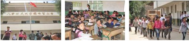 八宝小学地处偏僻山区,依山而建,与民房相邻,目前有三层教学楼和三层教师宿舍楼两栋建筑,除一个操场外,教学楼周围可供学生活动的空间不多。天慈在此捐建了教学楼和厕所,保养情况很好,楼面无裂缝、损坏,厕所使用情况也良好。因为学校没有围墙,在我们举行体育用品捐赠仪式的时候,周围的村民都站在自家房前围观。此校的桌椅都很破旧,天慈将考虑跟进此项目之资助。