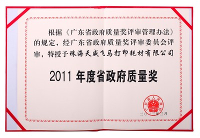 5月29日上午,广东省质量强省工作暨2011年度省政府质量奖表彰大会在广州广东大厦隆重举行。全球最大通用耗材制造商天威之旗舰工厂 -- 珠海天威飞马打印耗材有限公司,荣膺“2011年度广东省政府质量奖”并获省府百万奖励,成为8家获奖企业之一,也是获此殊荣的首家打印耗材企业、本届唯一的珠海获奖企业。