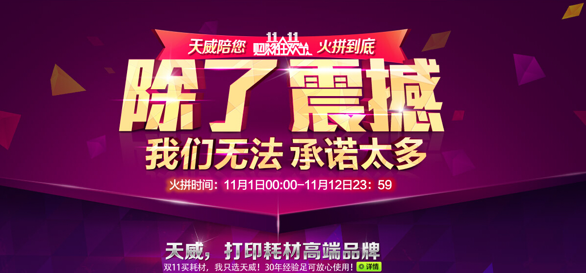 为迎接双十一,天威早在11月1日就率先在天猫、京东商城展开疯狂抢购模式,硒鼓、色带、墨盒、连供、碳粉等各大系列热门产品轮番以“超低价”姿态上阵,让客户提前体验狂欢的节奏。