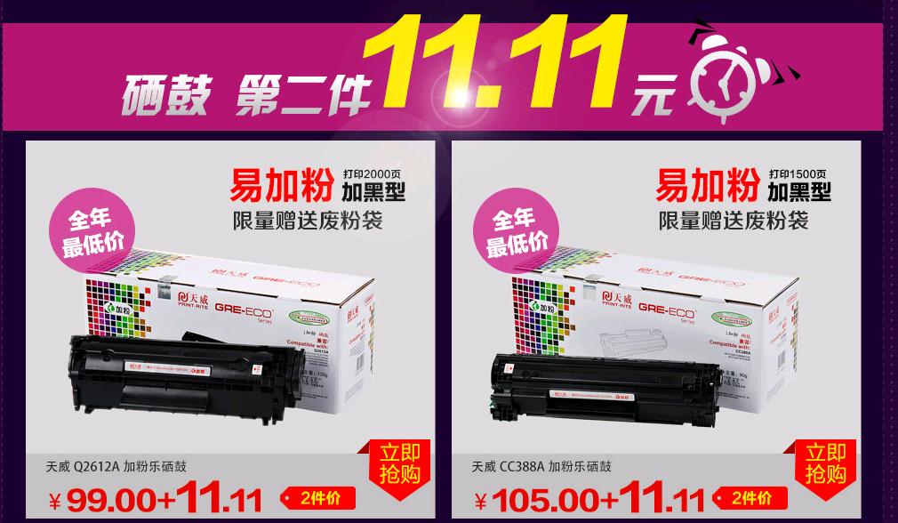 从11月10日凌晨到12日晚,天威产品全线进入大促模式,全面让利回馈客户。从天威天猫旗舰店可看到,天威碳粉第一支1.11元,硒鼓、彩鼓、墨盒、色带均是第二件11.11元。而且参与大促的产品均是最受客户热捧的爆款产品,例如天威Q2612A碳粉/硒鼓、天威CC388A碳粉/硒鼓等。