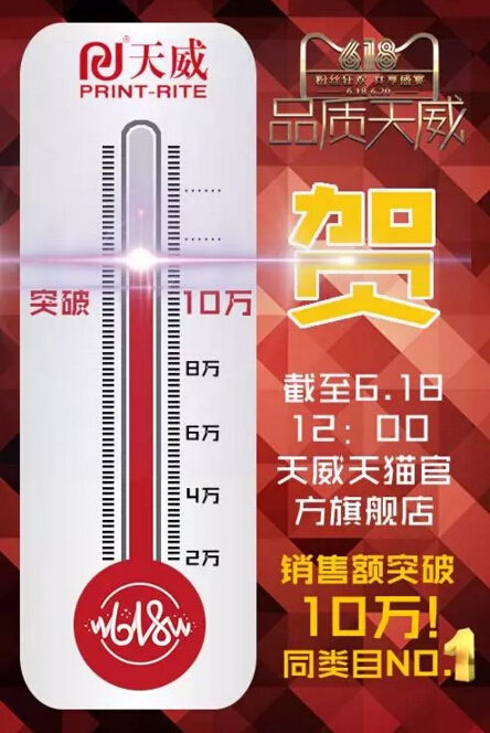 在这一场没有硝烟的年中促销大战中,天威天猫官方旗舰店作为打印耗材类目的知名店铺,在此次天猫年中大促中也交出了一份令业界震惊的答卷:截至6月18日12:00,天威天猫旗舰店的销售数据突破100000万,而最终的统计结果或许还会更多。这是继天威天猫官方旗舰店勇夺2015淘宝双十一耗材类销售冠军之后诞生的又一巅峰数据。
